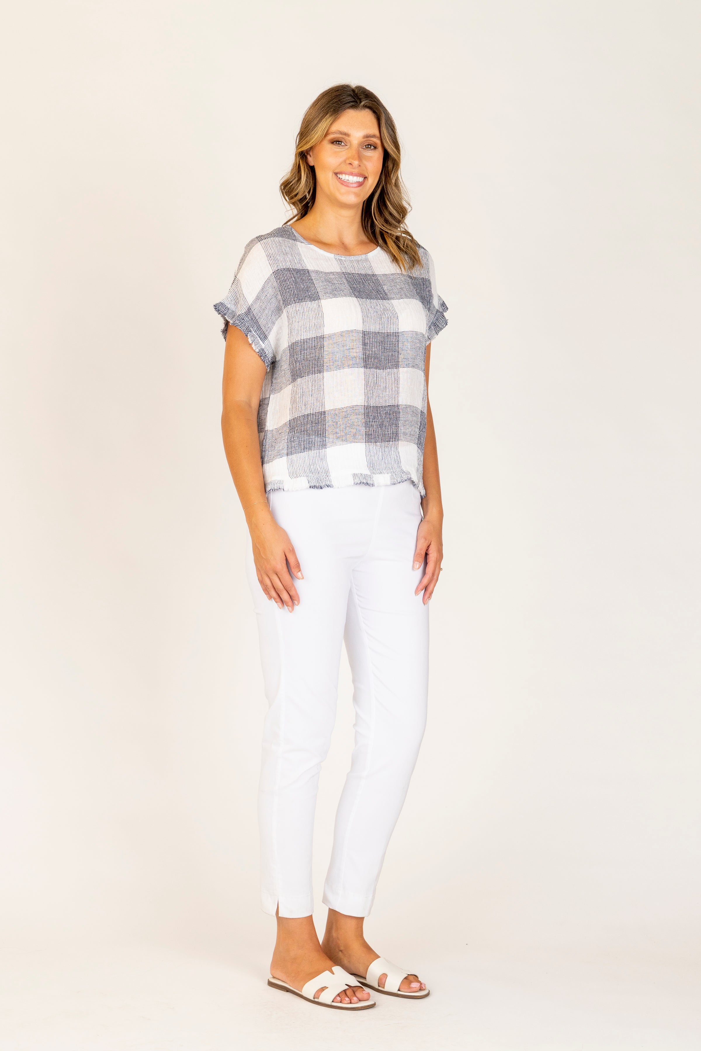 Lauren Navy Check Frill Top