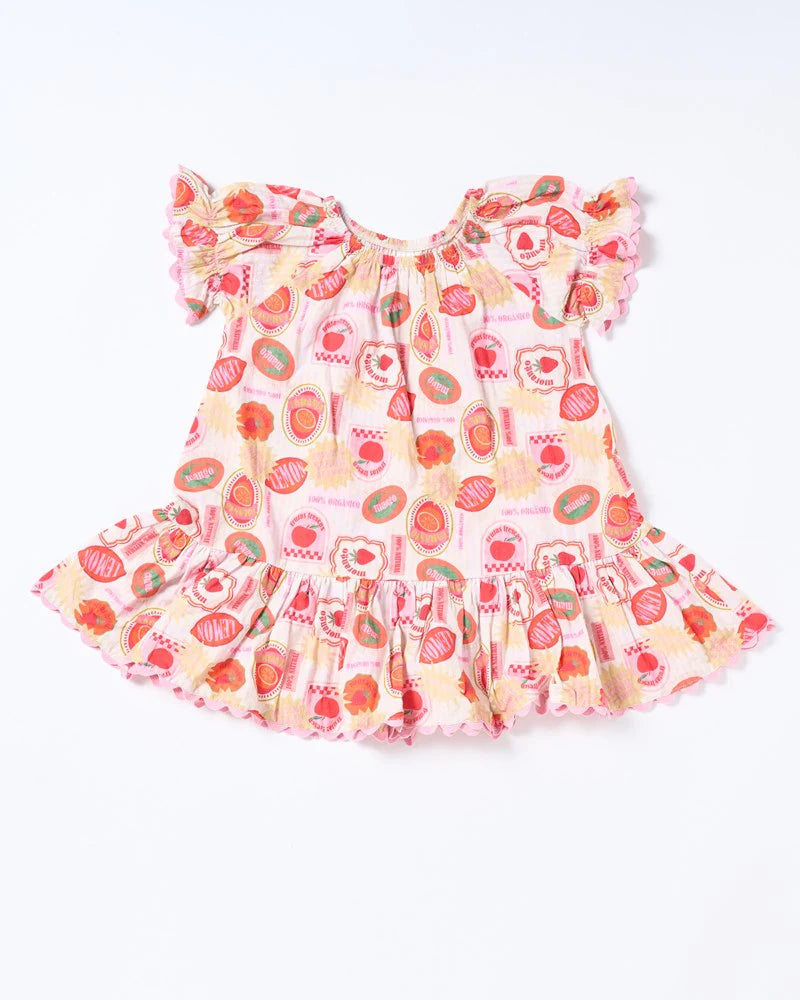 Our most-loved silhouette is back with a zesty twist! The Alexa Dress in Frutas Frescas is bursting with colour and fun, featuring a bold all-over fruit label print that’s as playful as it is sweet. With its signature puff sleeves, scalloped trims, and breezy tiered skirt, this easy slip-on style is perfect for warm-weather adventures and sunny celebrations.