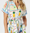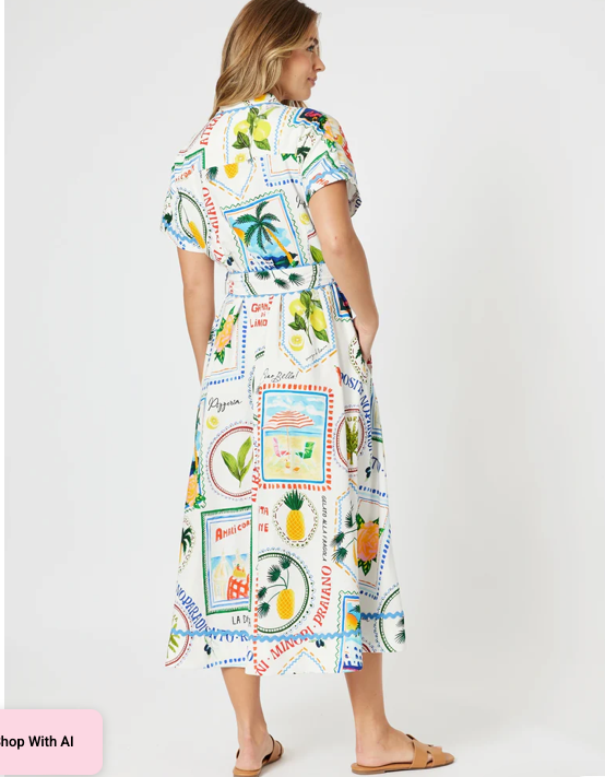 Featuring a vibrant Amalfi Coast–inspired postcard print, this dress celebrates sunny days with playful motifs of limes, palm trees, and seaside scenes.