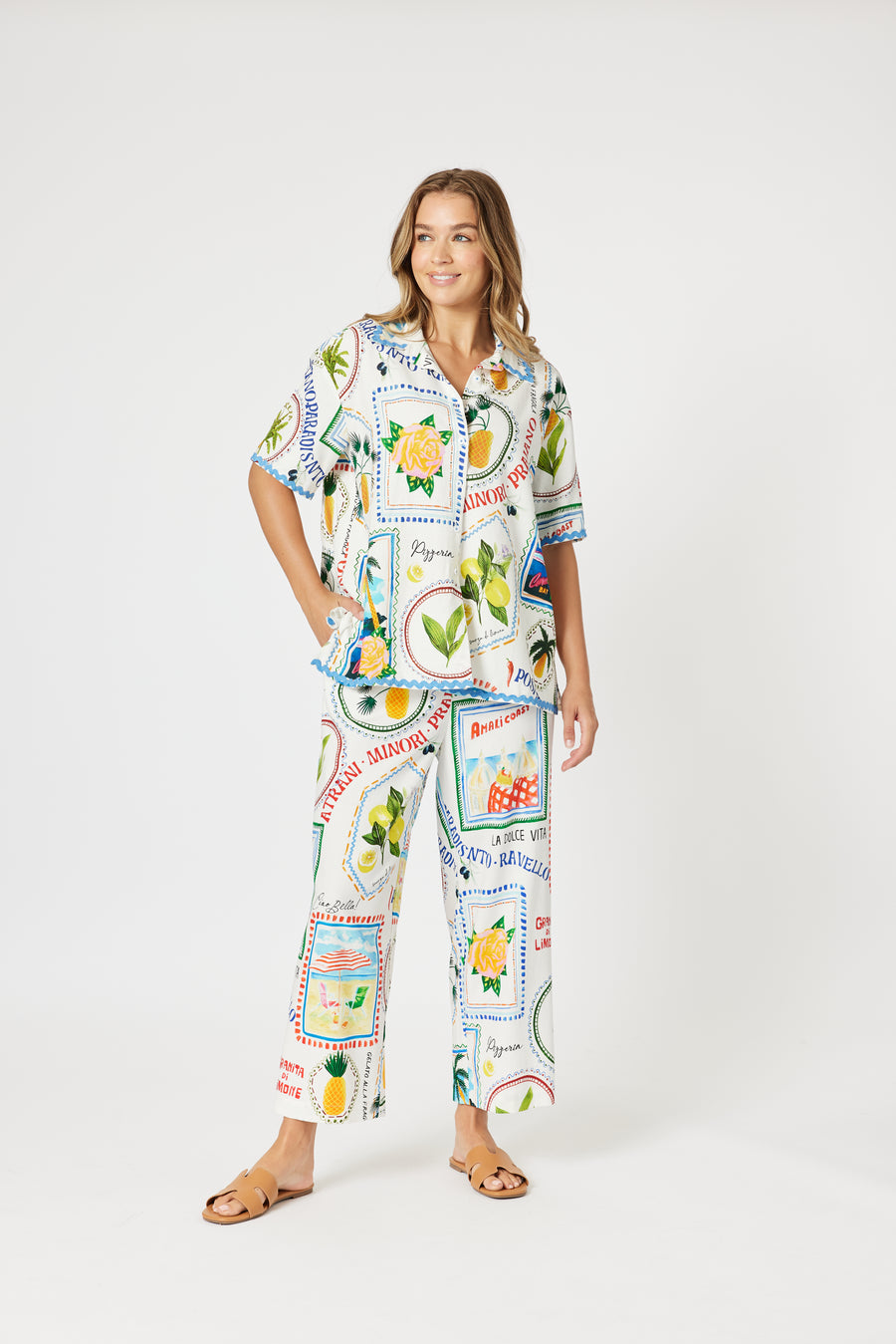 Adorned with playful postcard and stamp-style prints featuring limes, roses, and coastal icons, this shirt captures the spirit of summer holidays and la dolce vita.