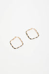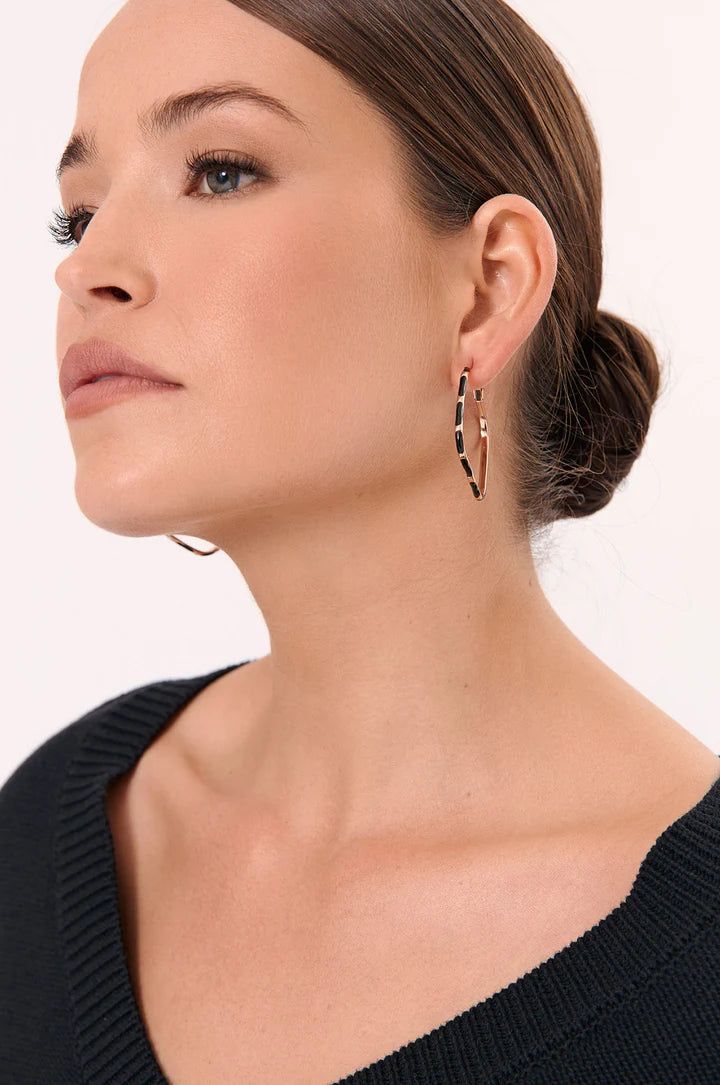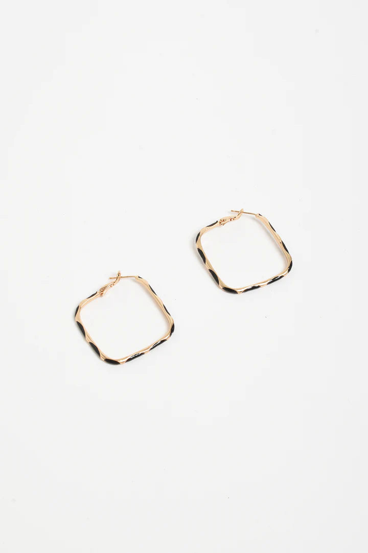 The Enamel Metal Bevelled Hoops in Black are diamond-shaped earrings featuring bevelled edges, glossy enamel detailing, and a lever back closure.
