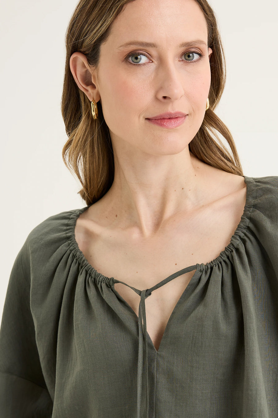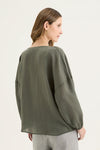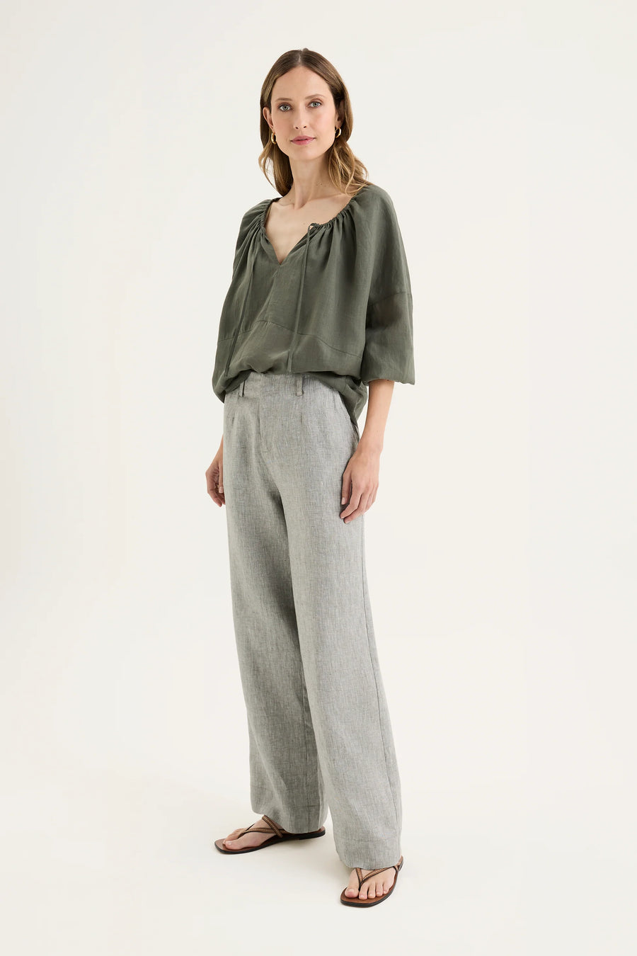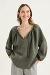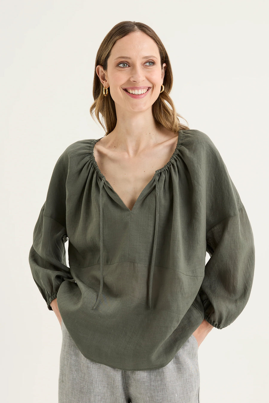 The Bohdi Top blends soft, bohemian-inspired flow with classic Yarra Trail detail. Crafted from a lustrous ramie-tencel blend, it drapes beautifully and moves with ease, offering a lightweight linen-like texture. The cut-away round neckline can be styled two ways - worn open for a relaxed V-neck effect, or drawn in with the encased drawstring for a softly gathered, rounded shape. Featuring a double-layered front yoke for structure, drop-shoulder sleeves with elastic cuffs for volume, and a high-low hem to enhance the flattering silhouette, it’s a versatile piece that is equally suited to casual days or elevated layering.