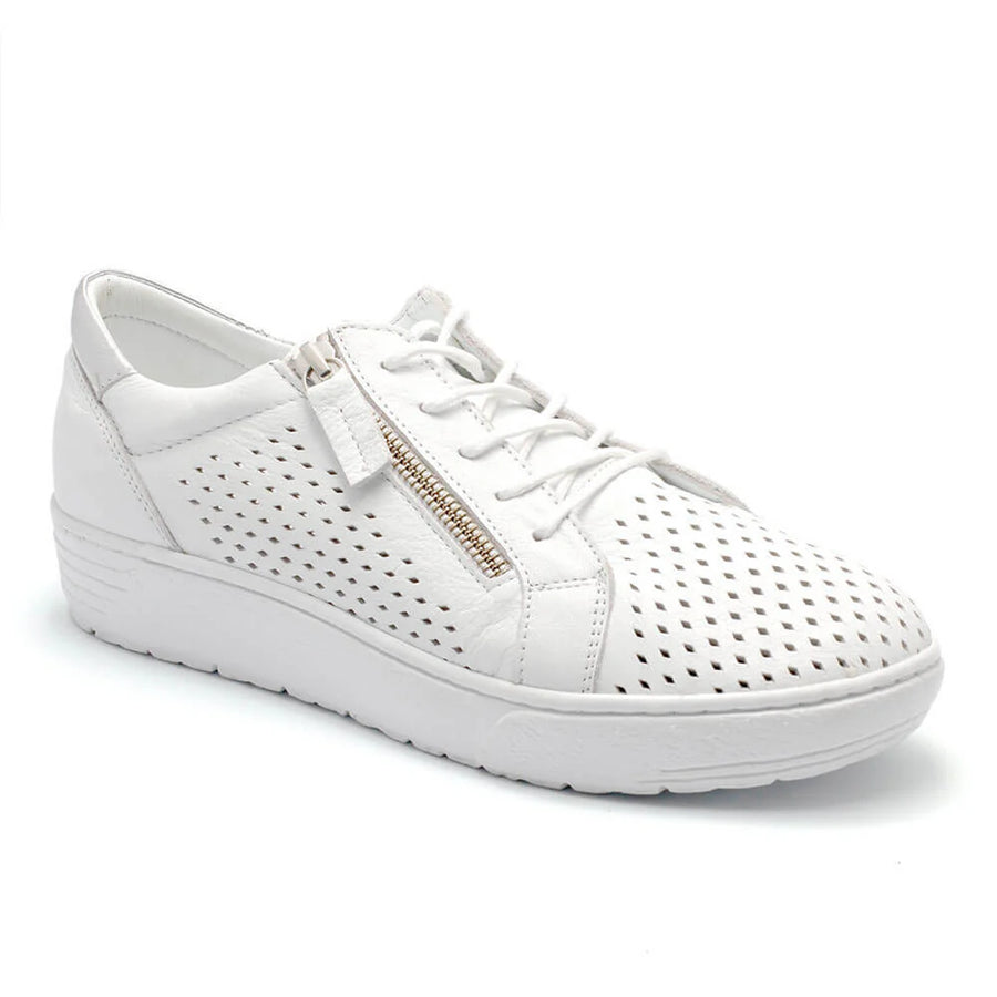 EG702 -the ultimate blend of comfort and trend-setting design. The lace and zip access ensure effortless wear, while the contrasting heel collar adds a touch of sophistication, making them a perfect choice for any occasion. Orthotic friendly, they accommodate personalized insoles for enhanced support. The punched leather uppers provide breathability, keeping your feet fresh. Step out in style and experience all day comfort with the EG702 Lace-Up Sneakers.