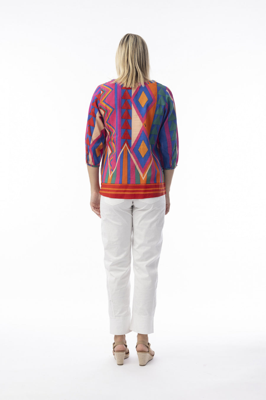 Elevate your beach wardrobe with our Jacuma boho top. This top features a relaxed fit, an open neckline with tassel details, delicate pleats at the bust, and vibrant prints. Elevate your summer wardrobe with effortless style.