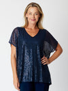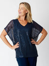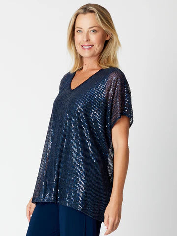 Elevate your evening look with our Kimono Top Tonight! This elegant top features stretch sequins, a relaxed fit, and a flattering V-neck. Its lined body offers comfort and style. Make a statement without breaking the bank with our affordable yet special top.