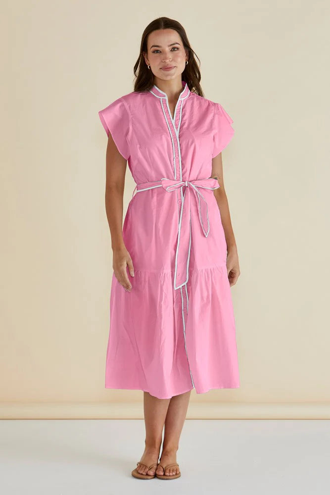 The Mari Dress is crafted from structured cotton poplin for a crisp, polished look. Featuring a button-up front with V-neckline and detachable waist tie, it offers classic, elevated style with relaxed ease. Short sleeves and a versatile silhouette make it an effortless transeasonal choice.