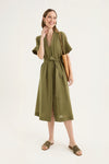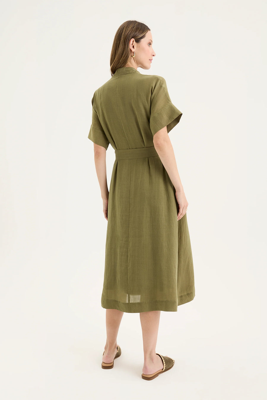 The Mateus Dress offers a considered balance of structure and ease, making it a true investment piece for this year's summer season and beyond. Crafted with a flattering V neckline, it’s defined by artfully placed front tucks that shape the silhouette while maintaining a fluid drape. The extended short sleeves and concealed button closure at the front add clean, understated detail, while the matching green waist tie allows the fit to be worn cinched or relaxed. Lined through the body for comfort and opacity, it also features functional inseam pockets for practicality. Falling to a mid-calf midi length in a semi-fitted, softly flared cut, it’s a versatile dress that feels equally at home styled for work, occasions, or everyday outfitting