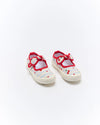 The Millie Mary Jane in Summer Cherries features a bright striped print with scattered cherries and an easy velcro strap for quick on and off. Lightweight, flexible, and perfect for park days, picnics, and everyday fun.