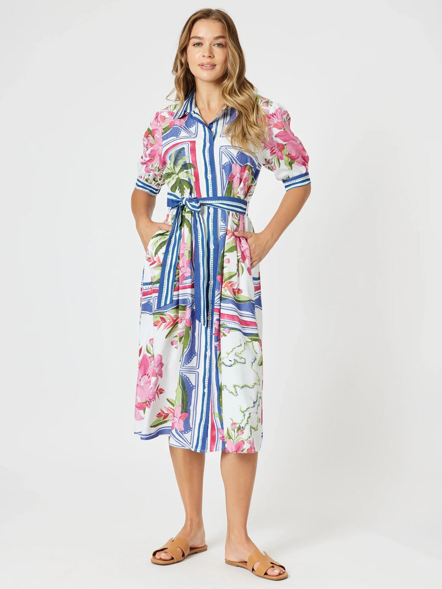 Channel timeless coastal glamour with The Monaco Print Dress, a striking piece that blends bold florals with nautical-inspired stripes.