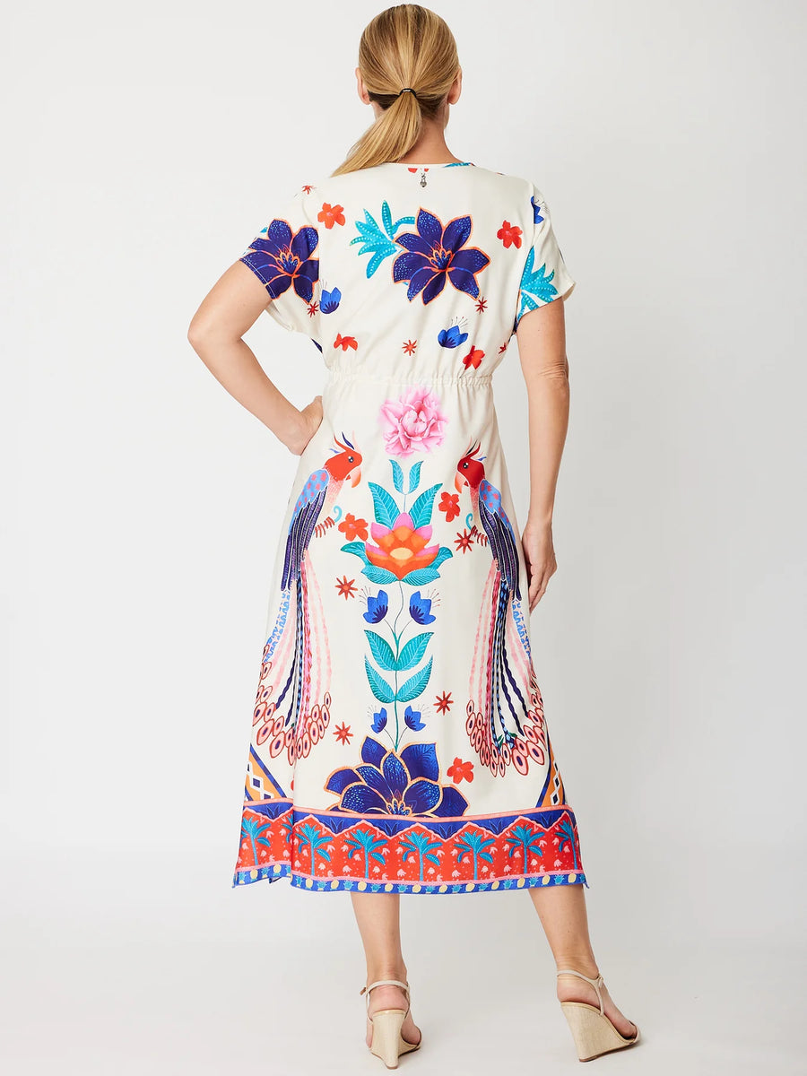 This Placement Print Kimono Dress features a stunning print, a flattering V-neck, and cap sleeves for effortless style. The functional drawstring lets you personalise the fit, while side splits and handy pockets add both comfort and practicality. Perfect for stylish, everyday wear.