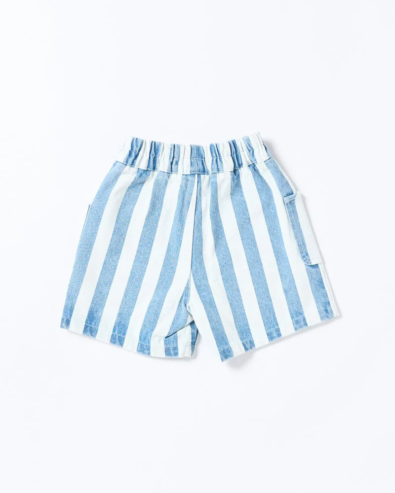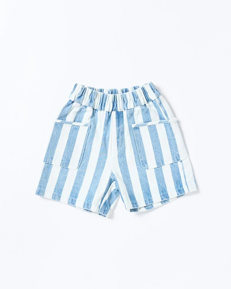 Demim Stripe - Classic with a playful twist, the Remy Short in Denim Stripe is your little one’s go-to for laidback summer days. Featuring bold vertical stripes in a soft washed denim and fresh white combo, this style includes roomy patch pockets and an elastic waistband for easy pull-on comfort. Ideal for beach days, playground hangs, and everything in between.