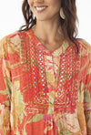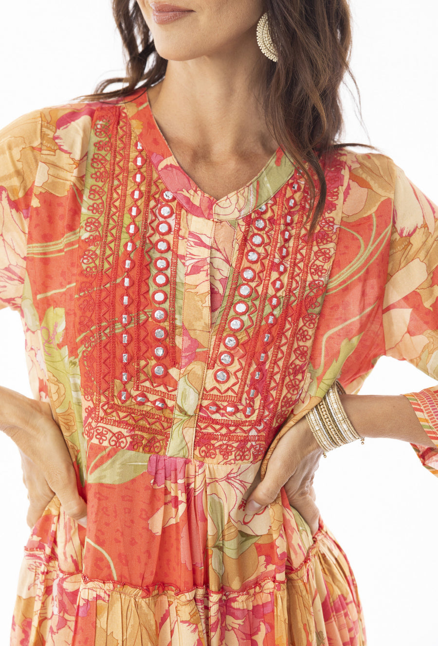Let your style wander with the Rosa Frill Sleeve Layer Dress—a breezy, feminine piece designed for sunlit days. Crafted in soft 100% rayon, it features a mandarin collar with a button-up front, embroidered detailing at the neckline, and playful three-quarter frill sleeves. The tiered skirt falls just at the knee, creating gentle movement with every step. Adorned in warm rose tones and hand-drawn prints, this dress brings a touch of wanderlust and charm to any occasion.