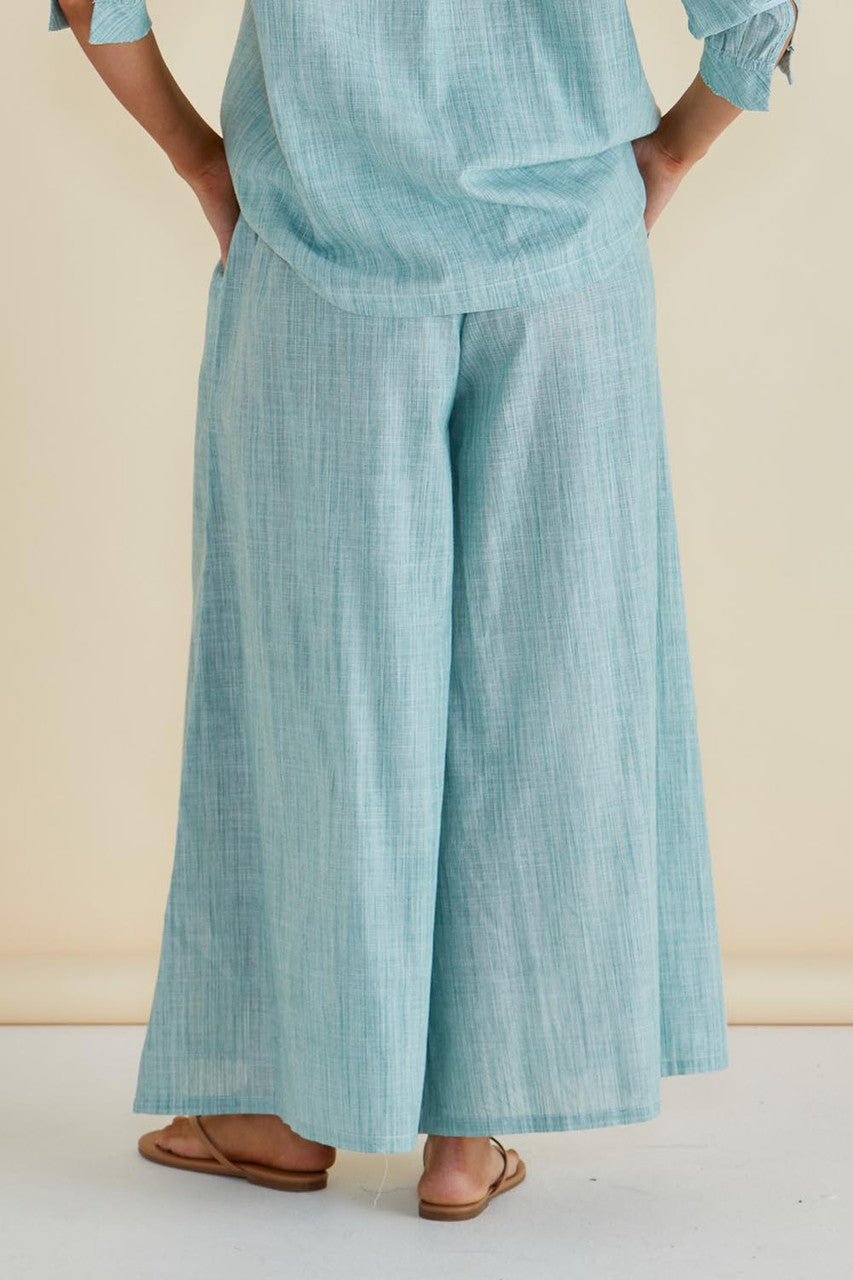 The Tatum Wide Leg Pant features handwoven cotton fabric with an elasticated waistband and wide palazzo leg. Practical pockets and mid-high rise create an elevated, comfortable silhouette. A classic, easy-to-wear pant ideal for transeasonal wardrobes.