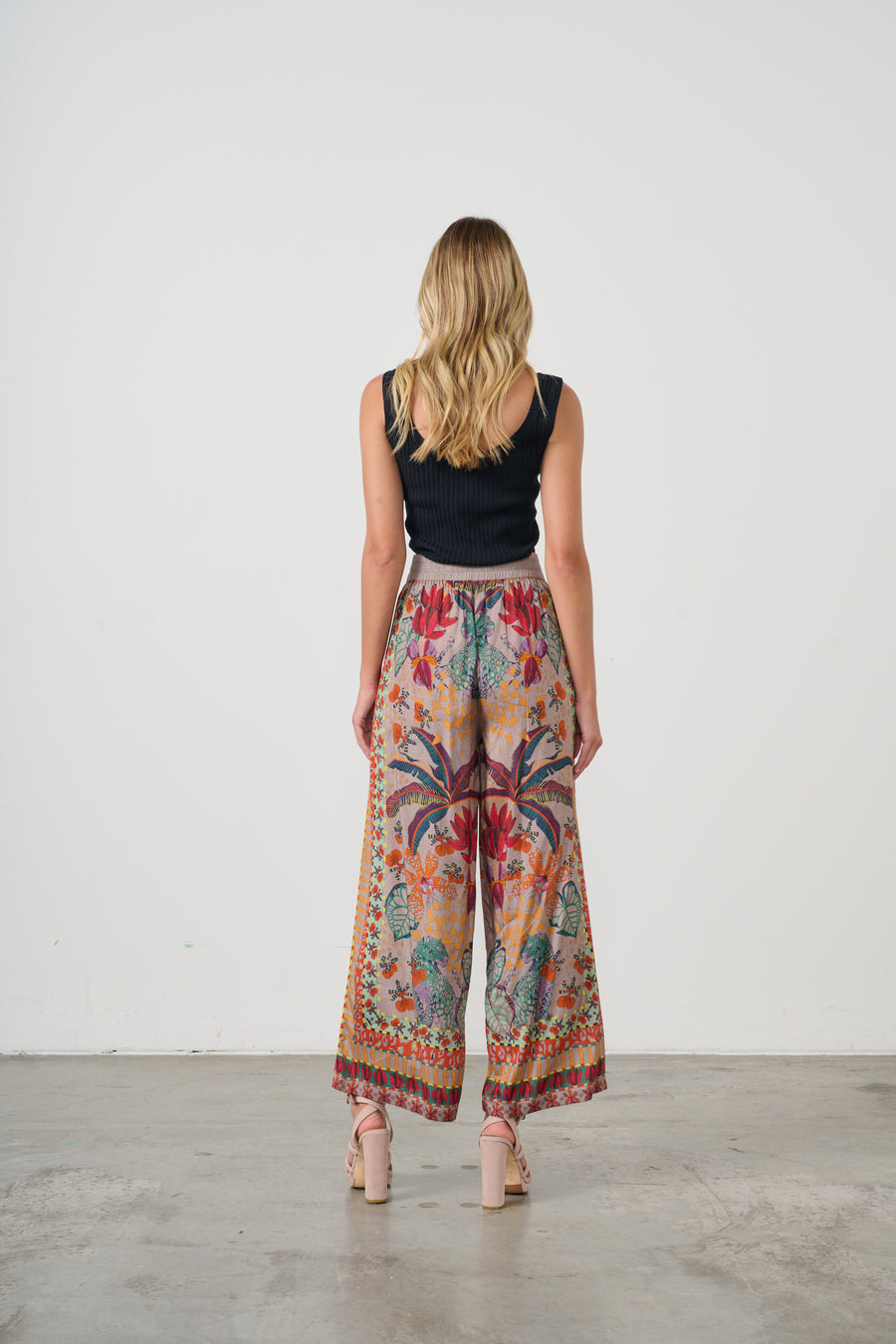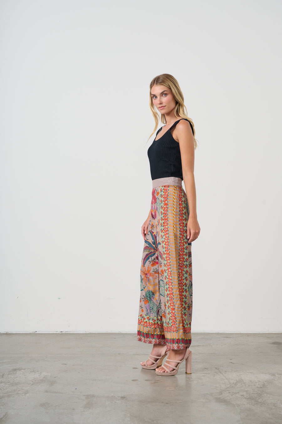 Flat front waist with elastic back, side pockets, with straight flowing leg.