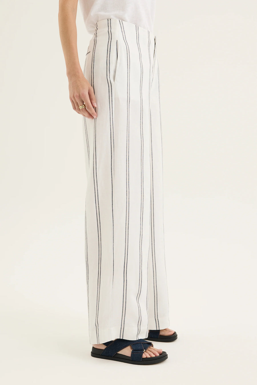The kind of pant you’ll rely on for polished, effortless days, the Fugitive Pant is cut from a soft linen-viscose blend, woven with an exclusive yarn-dyed vertical stripe. A semi-elasticated back waistband ensures comfort and gentle stretch on any body type, while the front fly and discreet hook-and-bar closure keep the waistband looking tailored and refined. The pants offer function without bulk, with both front in-seam pockets and back welt pockets for a clean finish. Based on our bestselling Paris Pant, this wide-leg style feels instantly familiar - easy to wear, easy to style. Pair it with the matching Fugitive Shirt for a modern, coordinated set, or style with soft knits and linen staples for everyday sophistication